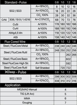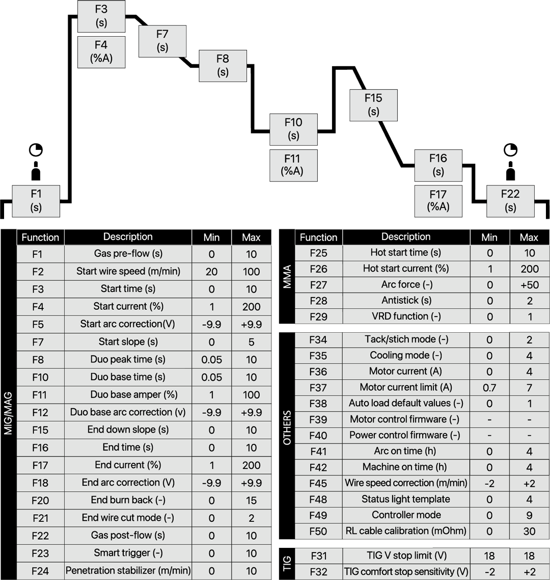 Function table for MIG/MAG, TIG and MMA welding, allowing advanced settings to be adjusted as needed. Maximizes the welding experience.