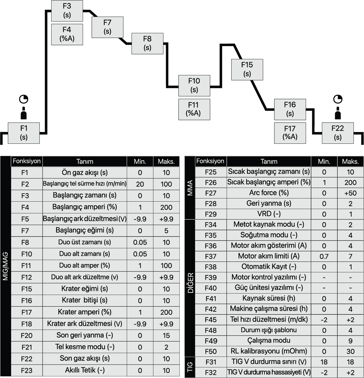 MIG/MAG, TIG ve MMA kaynakları için ihtiyaç halinde ileri düzey ayarları yapmaya imkan sağlayan fonksiyon tablosu. Kaynak deneyimini en üst düzeye çıkarır.